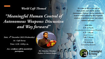 It is with pleasure to announce that Foresight Envoy's online programs are conducted in our very own virtual cafe 'Cafe Envoy.' The first event of Cafe Envoy held on 6th December 2023 under the theme of 'Wold Cafe' by educating several local and international participants on 'Meaningful Human Control and Strategic Foresight of Killer Robots'